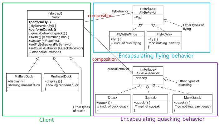 Quiz) 전략(Strategy) 패턴에서 객체 합성(Object Composition)과 위임(Delegation)이 어떻게 이용되는지 Java, C++ 등을 이용하여 예제 코드를 간략히 제시하시오.