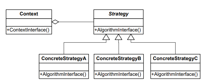 - 특정 동작을 수행하기 위해 스왑 할 수 있는 캡슐화된 알고리즘 집합을 정의