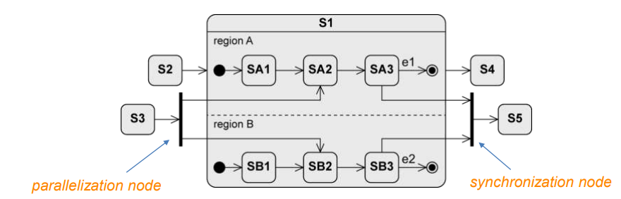 – One state of each region is always active at any point in time, (동시에 여러 state가 active)