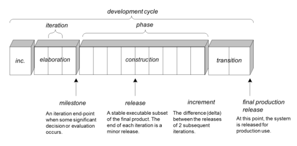- 4 major phases (Development cycle) : 각 iteration이 3주! I1, E1, E2, E3 이런 식으로 3주씩 진행