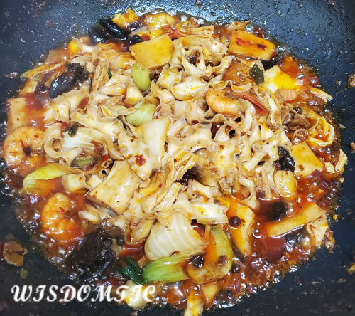 푸주가 부드러워 질 때쯤 야채와 마라샹궈 소스를 넣어 볶아줍니다