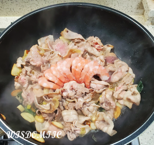 대패삼겹살을 넣고 볶다 하얗게 익으면 새우를 넣고 볶아줍니다